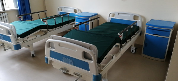 双摇护理床 配置缓冲餐桌板 四角静音轮 四挡铝合金折叠护栏