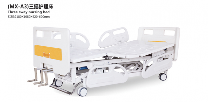 医用护理床:护理床的四个角落都安装有轮子,能方便病人移动,它的上中下相互衔接,可以灵活生姜,如果病人长时间躺着不舒服,就可以把护理床的支架摇起来,这样病人就可以躺着了,如果觉得脚步不舒服,也可以摇动脚步的支架,把腿部以下放低,让病人的姿势相对比较舒适。