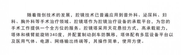 随着微创技术的发展,腔镜技术已普遍应用到普外科、泌尿科、妇科、胸外科等手术治疗领悟。腔镜塔作为腔镜设备的承载平台,为您的手术工作提供一个全方位的服务。腔镜塔采用天花悬挂方式,高承载能力,塔体和横臂能旋转340度,并配置制动刹车防漂移,塔体配备多层设备平台以及医用气体、电源、网络输出终端等;塔体高度可电动升降控制,其操作简单,使用方便。