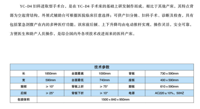 YC-D4进取型电动妇科手术床,是在YC-D4手术床的基础上研发制作而成。相比于其他产床,其特点背部为空起背结构,外景式辅助台可根据医院临床任意选择;可供产妇分娩、妇科手术、诊断及检查,具有包括紧急剖腹产在内的多种医疗功能。该床前后倾、上下升降均由电动推杆实现,操作灵活,安全可靠,方便医生和助产人员操作,是综合国内外各项医疗技术改进而来的医疗产床。