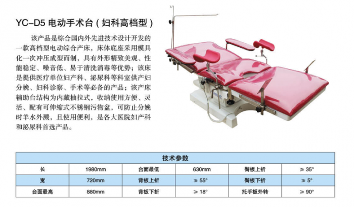 YC-D5型电动妇科手术床是综合国内外先进技术设计开发的一款高档款电动综合产床,床体底座采用模具化一次冲压成型而制,具有外形精致美观,性能稳定,噪音低,易于清洗消毒等优势;该床是提供医疗单位妇产科、泌尿科等科室供产妇分娩、妇科观察、手术等必备的产品;该产床辅助台结构为内藏抽拉式,收纳使用方便、灵活、配有可伸缩式不锈钢污物盆,可防止分娩时羊水外溅,且使用便利,是公立各大医院妇产科和泌尿科首选产品。
