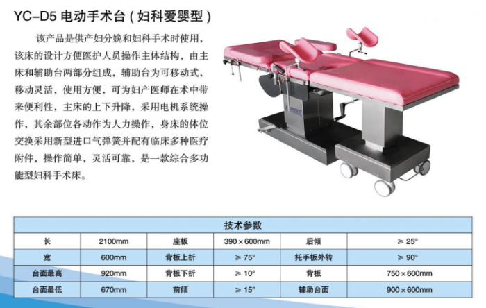 该产品是供产妇分娩和妇科手术时使用,该床的设计方便医护人员操作主体结构,由主床和辅助台两部门构成,辅助台为可移动式,使用方便,可为产妇医师在手术中带来便利性,主床的上下升降,采用电机系统操作,其余部位个动作为人力操作,床身的体位交换采用新型进口气弹簧并配有临床多功能医疗附件,操作简单,灵活可靠,是一款综合多功能型妇科手术床。