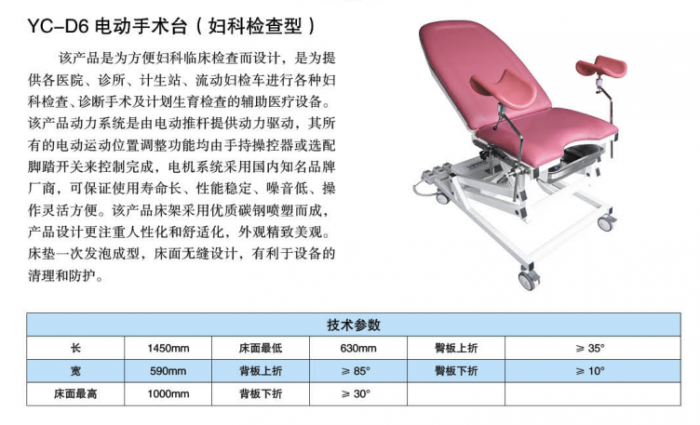 该产品是为方便妇科临床检查而设计,是为提供各医院、诊所、计生站、流动妇检车进行各种妇科检查、诊断手术及计划生育检查的辅助医疗设备。该产品动力系统是由电动推杆提供动力驱动,其所有的电动运动位置调整功能均由手持操控器或选配脚踏开关来控制完成,电机系统采用国内知名品牌厂商,可保证使用寿命长、性能稳定、噪音低、操作灵活方便。该产品床架采用优质碳钢喷塑而成,产品设计更注重人性化和舒适化,外观精致美观。床垫一次发泡成型,床面无缝设计,有利于设备的清理和防护。