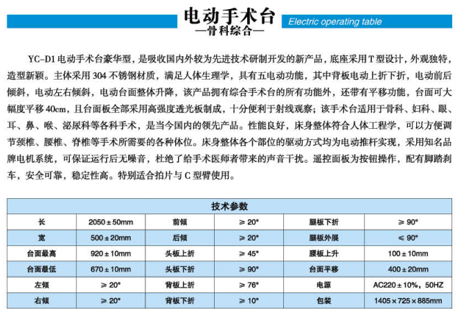 YC-D1型豪华电动手术台,采纳吸收国内外较为先进技术研制开发的新产品,产品主体采用304不锈钢材料,满足人体生理学,该产品具有五电动功能,其中背板电动上折下折,电动前后倾斜,电动左右倾斜,电动台面整体升降,该产品拥有综合手术床的所有功能外,还带有平移功能,台面可大幅度平移40cm,且台面板全部采用高强度透光板制成,十分便利于射线观察;该手术台适用于骨科、妇科、眼、耳、鼻、吼、泌尿科等各种手术,是当今国内的领先产品。