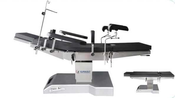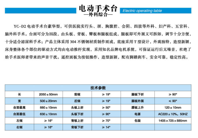 YC-D2电动手术台豪华型,可供医院实行头、颈、胸腹腔、会阴、四肢等外科、妇产科、五官科、脑外科手术。台面可分为四段,由头板、背板、臀板和腿板组成,腿板即可外展又可拆卸,调节十分方便,十分适合泌尿科手术;产品主体采用304不锈钢材质制作而成,底座采用T型设计,外观独特,造型新颖。床身整体各个部位的驱动方式均由电动推杆实现,采用台湾知名品牌电机系统,可保证运行后无噪音,杜绝了给手术医师者带来的声音干扰。遥控面板为按钮操作,造型新颖,配有脚踏刹车,安全可靠,稳定性高。